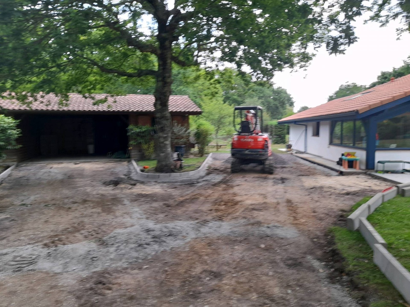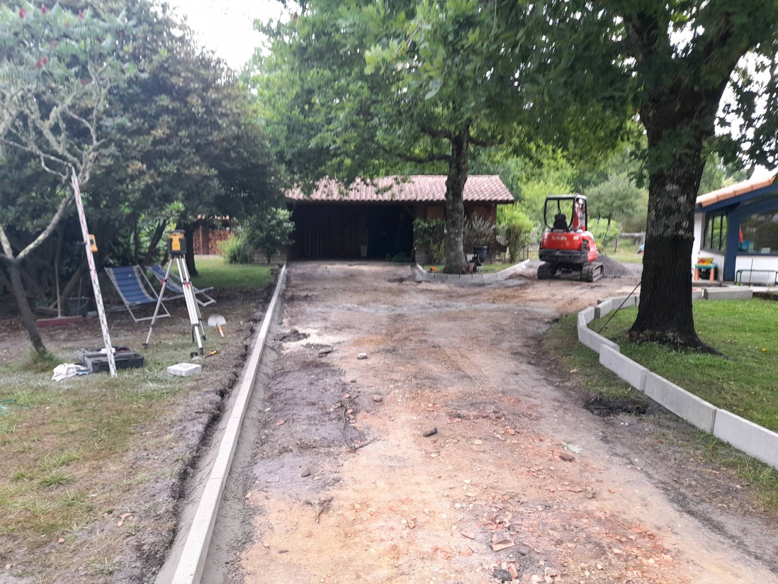 Travaux dans le nord des landes : réalisation d'une entrée en enrobé noir avec dans un premier temps un décroutage de l'existant et son évacuation en centre de retraitement et dans un second temps, la pose de bordure P1 et accodrains sur lit de béton puis reprofilage en calcaire gris 0/20 compacté et pose d'enrobé noir BB 0/6.